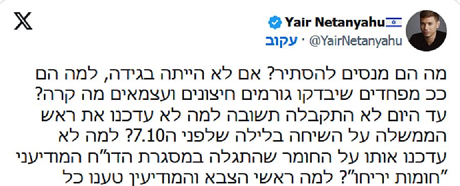 יאיר נתניהו, בנו של ראש הממשלה, המשיך גם הבוקר להדהד את תיאוריית הקונספירציה שנפוצה בחוגי הימין הפוליטי מאז פרוץ המלחמה, לפיה הטבח הנרחב ב-7 באוקטובר התאפשר הודות לבגידה מבפנים.