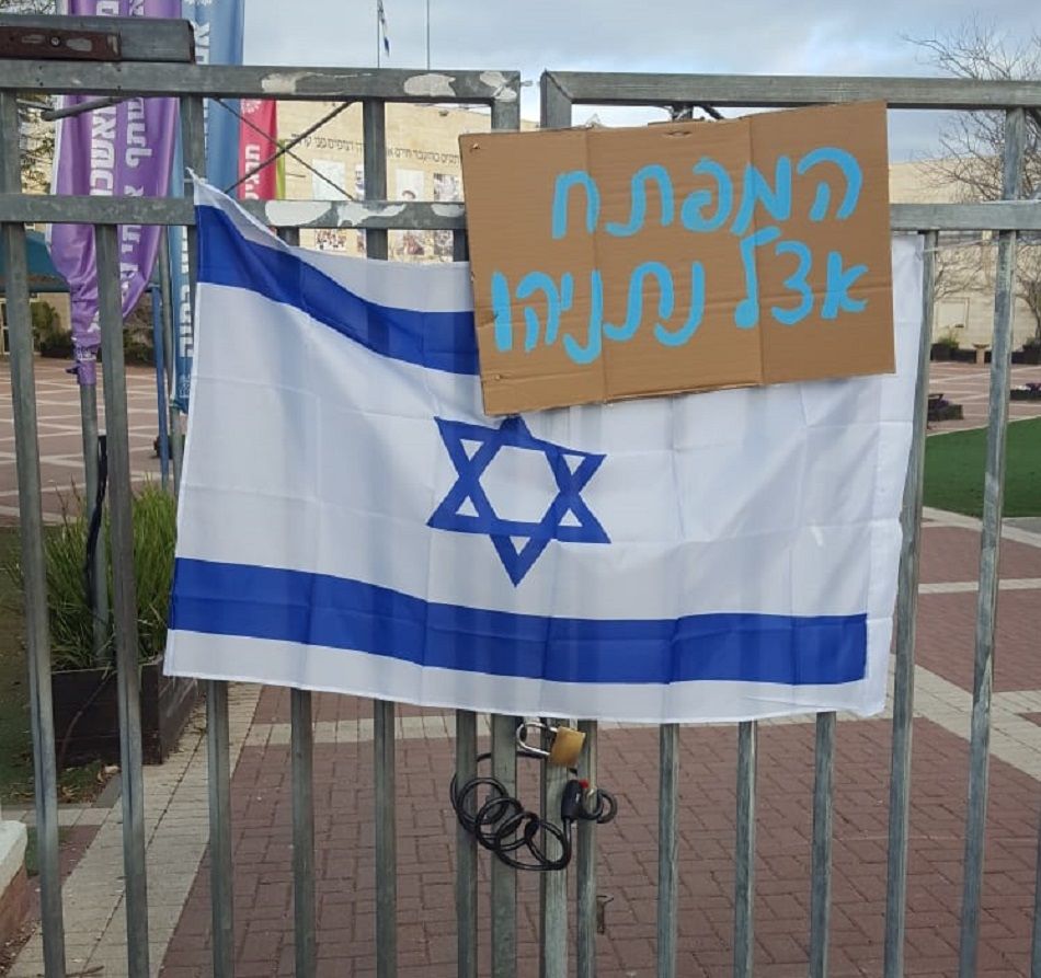 על פי הפרסום באתר 'כיפה', ראשי הישיבה שהגיעו בשעות הבוקר המוקדמות הופתעו לגלות את שער הישיבה נעול, כאשר עליו מתנוסס דגל ישראל ושלט עם הכיתוב "המפתח אצל נתניהו". את התמונה שיתף עיתונאי ערוץ 14 אראל סגל, תושב מודיעין, בחשבון הטוויטר שלו.