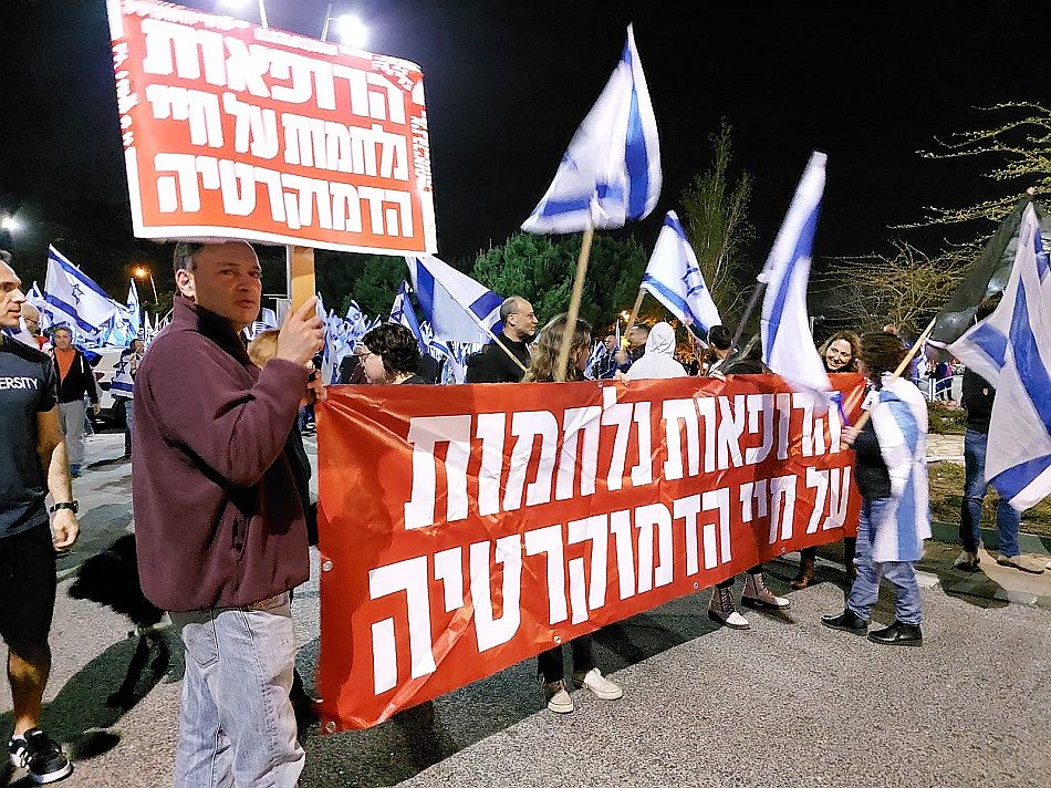 בפעם השנייה בתוך 48 שעות הגיעו אלפי מפגינים למחות מול ביתו של שר המשפטים יריב לוין, ברחוב מנחם בגין בעיר.