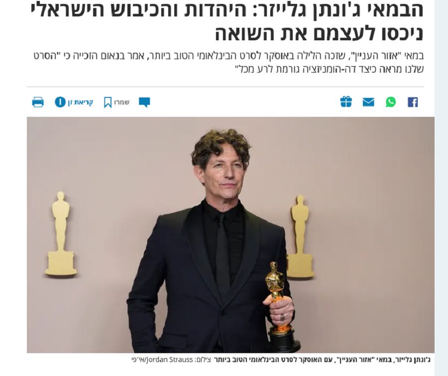 עד שעלה לבמה הבמאי היהודי ג'ונתן גלייזר, שהשמיע נאום אנטישמי על פעולות צה"ל בעזה. אגב, הוא זכה באוסקר על סרט שעוסק בשואה אודות חייו של מפקד מחנה אושוויץ ורעייתו בשואה. אתם מבינים את זה? ג'ונתן היהודי עושה חיבור בין התנהגות צה"ל ומדינת ישראל לשואה, במובן השלילי ביותר מבחינתנו.