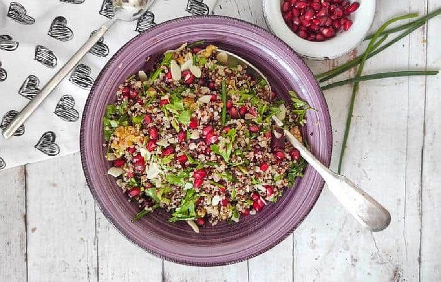 אופן ההכנה: מבשלים קינואה במים כ-15 דקות עד שכל הנוזלים נספגו. מצננים, מפוררים בעזרת מזלג ומעבירים לקערת הגשה. קוצצים את עשבי התיבול ומוסיפים לקערה יחד עם מחצית מהאגוזים וגרעיני הרימון. מתבלים במיץ לימון טרי, שמן זית, מלח ופלפל בהתאם לטעם ומערבבים. טועמים ומתקנים תיבול. מקשטים באגוזים ורימונים ומגישים.