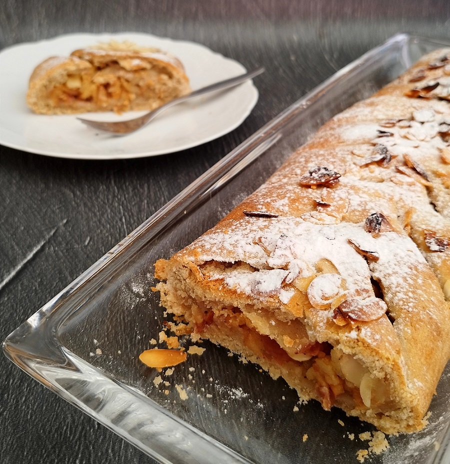 מגררים את התפוחים, מוסיפים קינמון אם רוצים, מערבבים ומניחים במננת מעל קערה להגרת נוזלים. אפשר גם לסחוט מעט. מוציאים את הבצק ומרדדים על משטח מקומח או נייר אפיה למלבן בעובי 0.5 ס"מ. מניחים את התפוחים בערימה לאורך המלבן, מפזרים מעט קינמון ו/או אגוזים או קוקוס ומגלגלים לרולדה. חותכים את הרולדה לפרוסות במלי להפריד אותן ואופים. אופים כ 20 דקות עד הזהבה ומצננים. ניתן לשמור בקופסא סגורה במקרר מספר ימים.