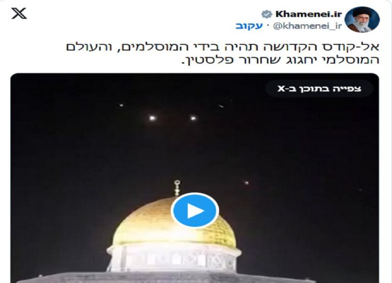 הנשיא חמינאי צייץ הלילה בעברית בחשבון ה-X שלו: "אל-קודס הקדושה תהיה בידי המוסלמים, והעולם המוסלמי יחגוג שחרור פלסטין"